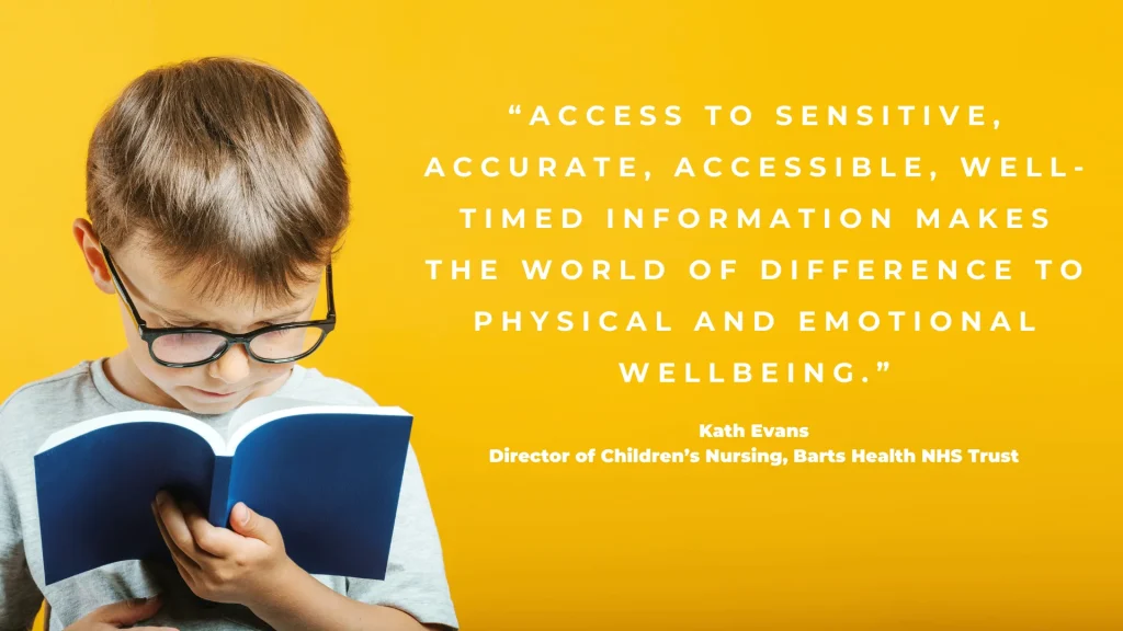 Kath Evans, Director of Children’s Nursing, Barts Health NHS Trust recently said “…access to sensitive, accurate, accessible, well-timed information makes the world of difference to physical and emotional wellbeing. It helps put people in control, resulting in better outcomes.”